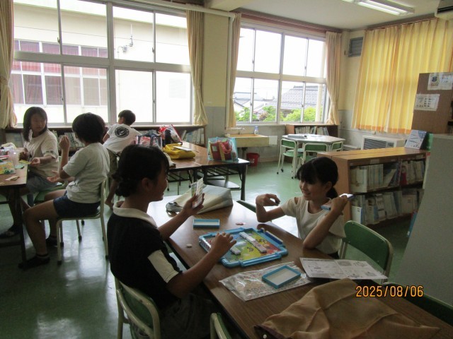 夏休みに入り、初めてプール開放を行いました。雨が降り、途中で切り上げました。心地よい風も吹き、短い時間でしたが、楽しく過ごしていました。プールの後は、図書室で友達とゲームを楽しむ子供たちも見られました。
