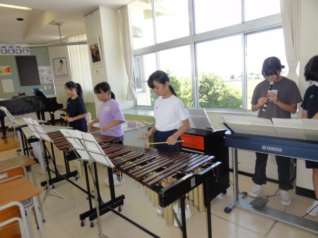 区域連合音楽会に向けて、上学年の子供たちはとても熱心に練習に取り組んでいます。夏休み中に、子供たちは、バチを使っての木琴の練習や、リコーダーでの練習に励んでいました。