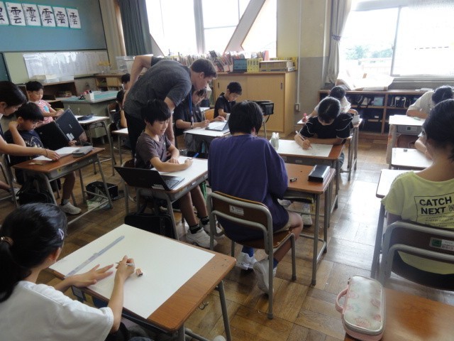 3・4年生の図画工作科では、夏休みの思い出を絵で表す学習に取り組んでいます。子供たちはどのように表現するかをよく考え、構成を見直しながら熱心に描いていました。