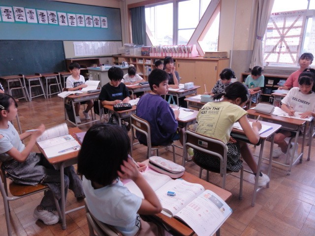 算数科の学習で、4年生はわり算の筆算の方法について考えました。ノートに課題を書いたり、友達の意見を聞いたりして、集中して取り組んでいました。