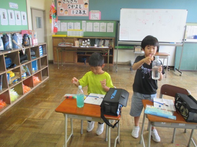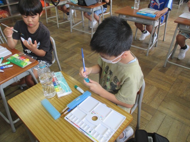 水彩絵の具を使って「カラフル色水」づくりをしました。絵の具は、水の量によって色の濃さや透き通り方が変わったり、混ぜると色が変わったりすることが分かりました。