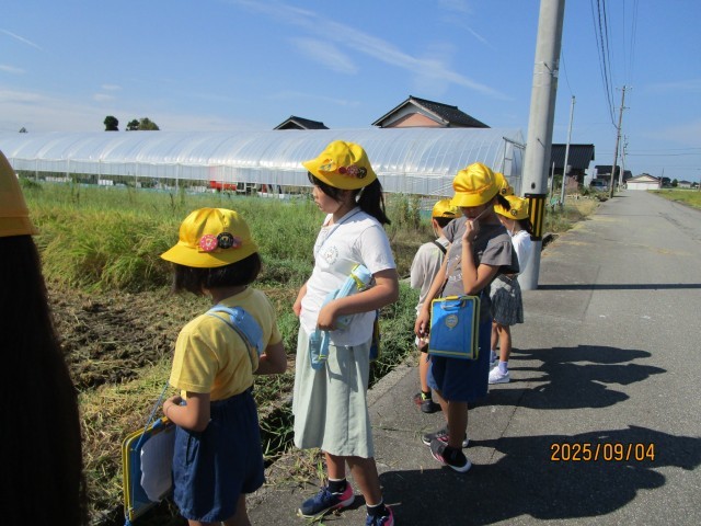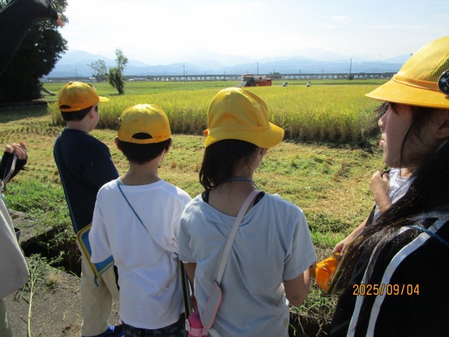 今日は、総合的な学習の時間「水橋のすてき」の一環として、水橋東部の米作りの見学に行きました。稲刈りの様子を見たり、米作りの大変さなどをインタビューしたりしました。「こんな暑い中頑張っているのすごいな」「水橋東部は水不足になっていないなんてすごいな」と様々な声が聞かれました。