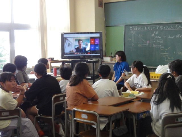 給食の時間に、英語によるイマージョン的教育の一環として、ALTの先生によるイングリッシュプログラムをオンラインで行っています。ALTの先生が、教室に入り、英語によるクイズを出題されます。子供たちは、ALTの先生の英語による言葉を聞き取り、クイズを楽しんでいます。