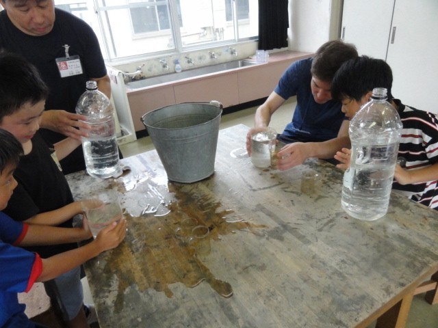 2年生は、算数科で水のかさの学習をしています。1リットルのますや1デシリットルのますを使い、水の量を測定しました。途中で、水がこぼれると、もう1度測り直し、正確に水のかさを測定していました。