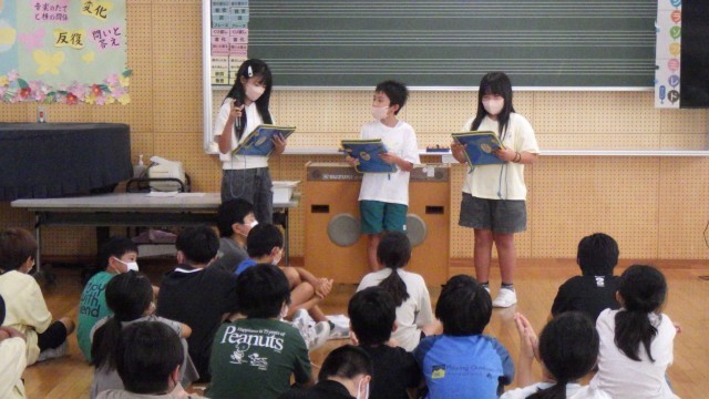 富山テレビの見学では、スポーツ中継で使う大きなテレビカメラを触らせていただいたり、夕方のニュースのセットに座らせていただいたりしました。アナウンサーの方が本番直前まで何度も何度もニュース原稿を読む練習をされている姿を見て、「こんなに直前まで練習するんだ!」と驚いていました。午後は水橋中部小で昼食を食べた後、各校が考えたゲームで交流しました。笑顔があふれる楽しい時間となりました。