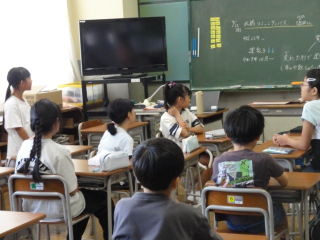 3年生と4年生は、総合的な学習の時間で地域のことについて学習しています。子供たちは、水橋東部校区を走るコミュニティバスに関心をもち、さまざまな疑問について調べたいと思っています。次の時間には、コミュニティバスの理事長さんにインタビューし、知りたいことを調べる学習をします。