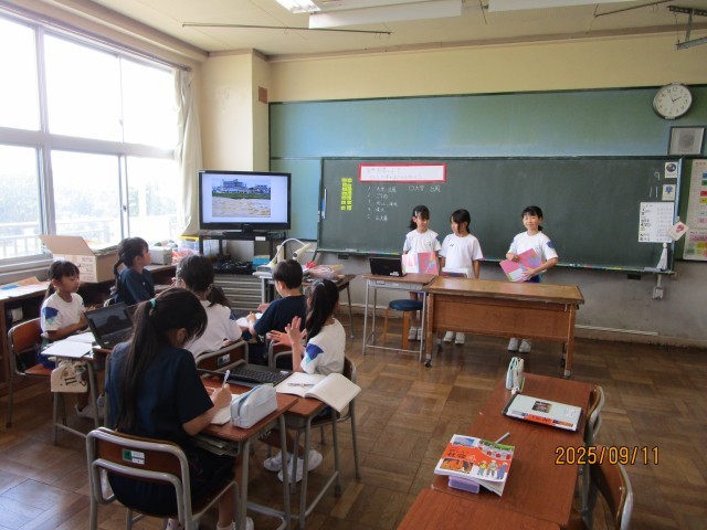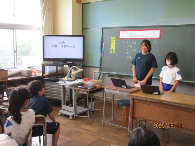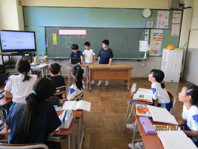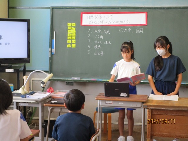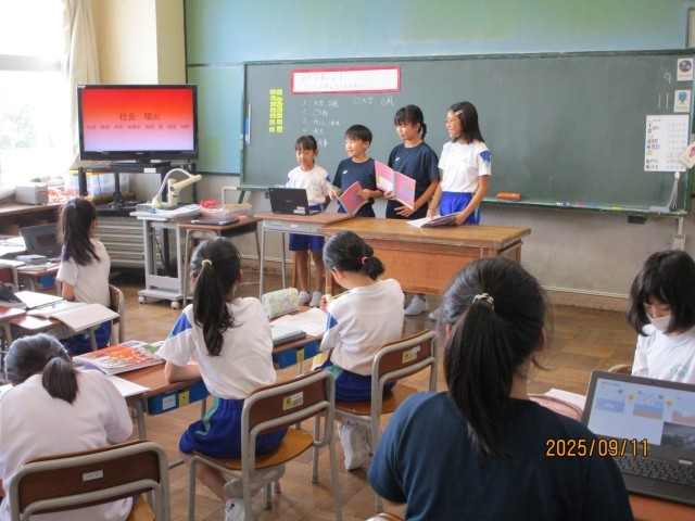 社会科では「自然災害からくらしを守る」という学習をしています。今日は、各グループによる「自然災害の被害」の発表を聞き合いました。スライドに写真や動画を貼って、上手に説明をしていました。