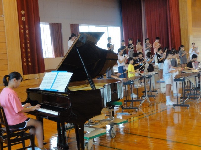 連合音楽会に向けて、上学年の子供たちは、毎日練習しています。今まで音楽室で練習してきましたが、体育館で練習を始めました。広いオーバードホールで、演奏がしっかりとできるように子供たちはがんばっています。