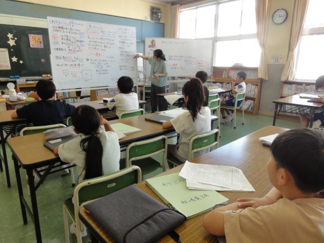 3・4年生は、地域の方へインタビューをするなどして、地域のすてきを探っています。地域の田んぼを見学しインタビューしたことを基に、学んだことを話し合っていました。