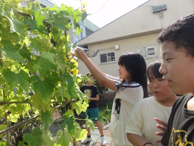 5年生は、理科でヘチマの実のでき方を観察しています。袋を付けため花のつぼみが、花を咲かせ、今後どのように変化していくかを観察していきます。