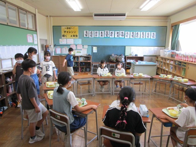 友達の給食を配ってあげるなど、みんなで協力して給食の準備をしています。今日は、誕生日の友達がいたので、牛乳で乾杯をしました。みんなの笑顔があふれた給食時間でした。