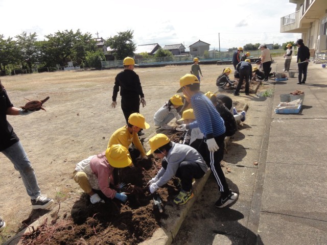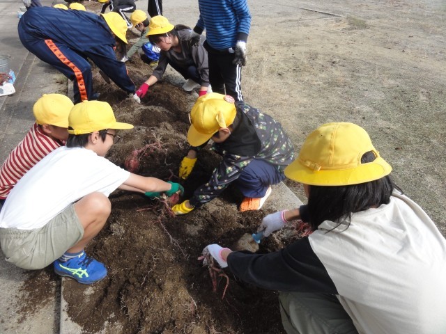 学校の花壇にサツマイモを植え、いよいよ収穫することとなりました。とても大きなサツマイモができており、子供たちは収穫をとても喜んでいました。