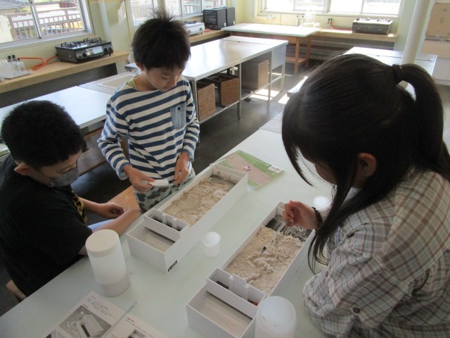 5年生の理科では、流れる水のはたらきを確かめる実験を行いました。実験装置に砂を入れ、細い溝を作って、水を流します。水と一緒に砂が流れていく様子や、斜面の下に砂がたまる様子を観察し、流れる水のはたらきを見出していました。