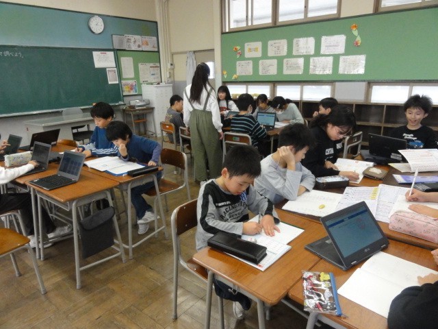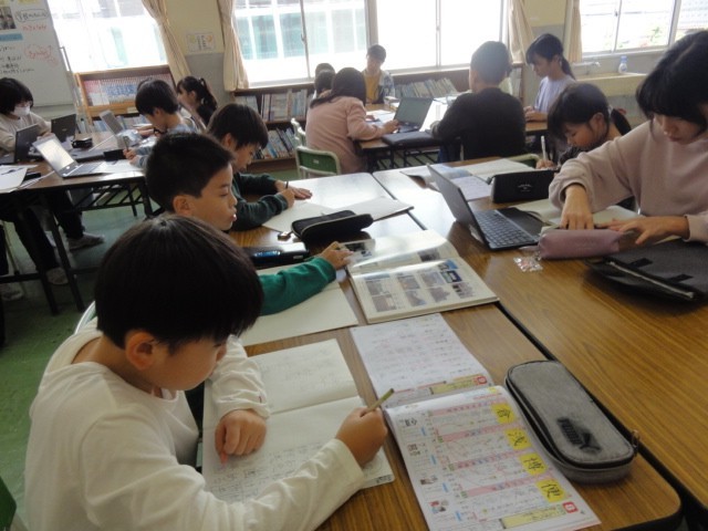 自主タイムで、子供たちは落ち着いて取り組んでいます。答え方について友達からアドバイスをもらう子供もいます。各自が課題を決め、集中して取り組む姿から、しっかりと学習に取り組むことが定着していることを感じます。