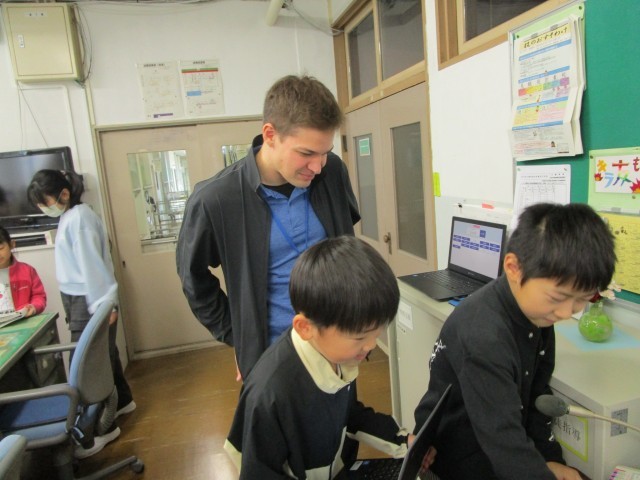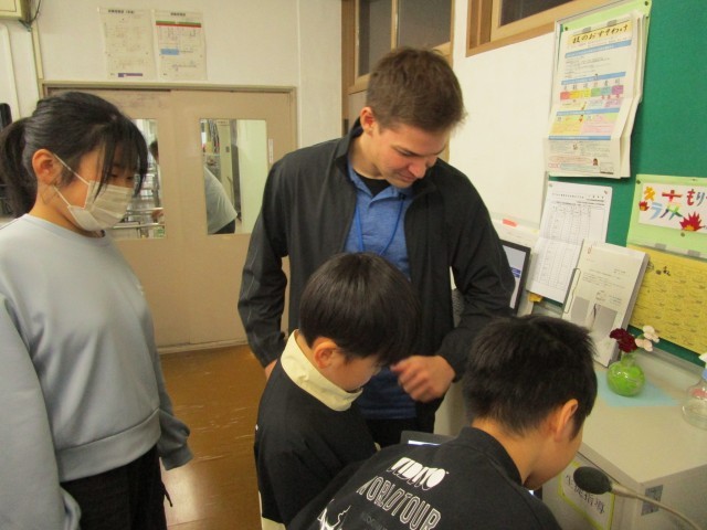 イマージョン委員として活動している4年生の子供たち。給食の時間に、「英語でなんて言うの?~How do you say it in English?~」の活動を担当している子供が、イマージョン講師とともに放送をしました。今日は「私はハートフル委員会です。」や「やきいもがおいしかったです。」という文章を英語で言うとどんな文章になるのかを教えてもらいました。