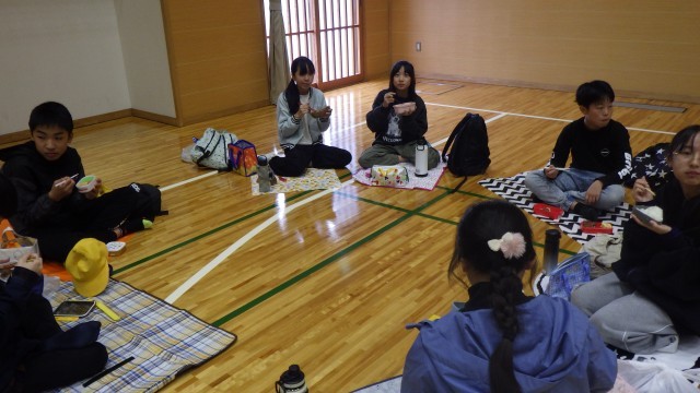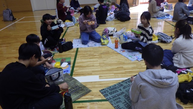 「こころの劇場」の観劇後、水橋会館で4校交流活動をしました。班ごとに自己紹介をしたり、話をしたりしながらおいしいお弁当を食べました。