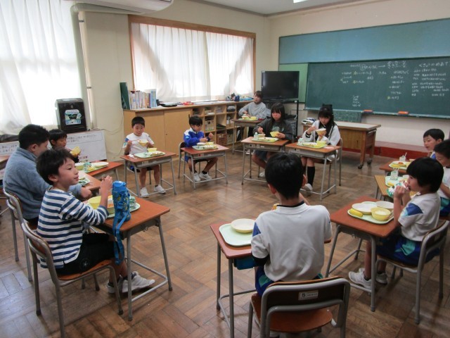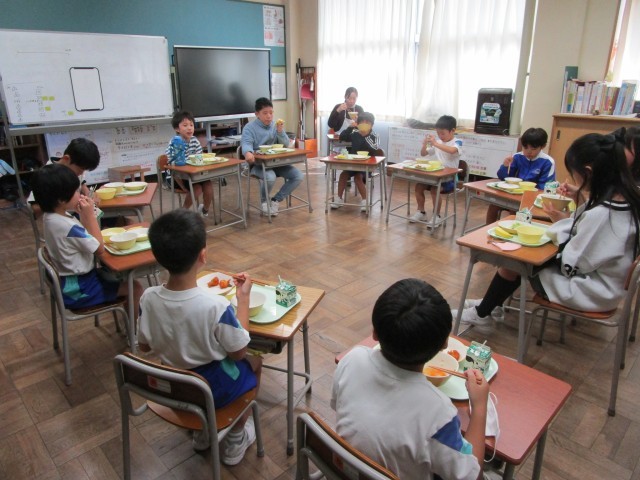 今日は1・2年生教室にお邪魔して、1・2・5年生で給食を食べました。みんなで楽しい時間を過ごすことができました。