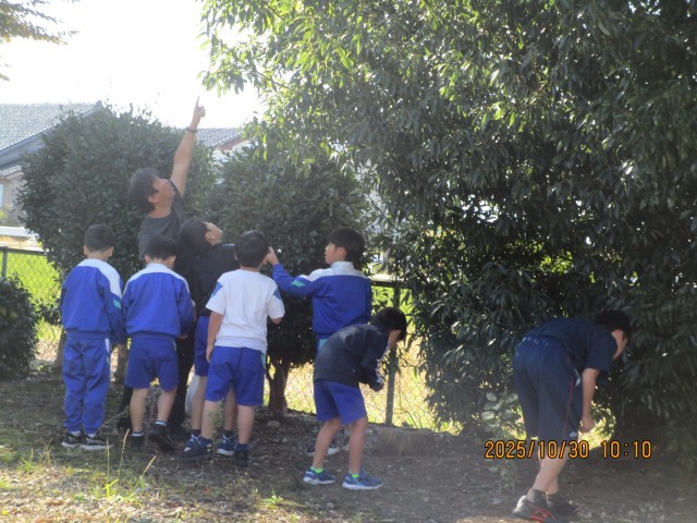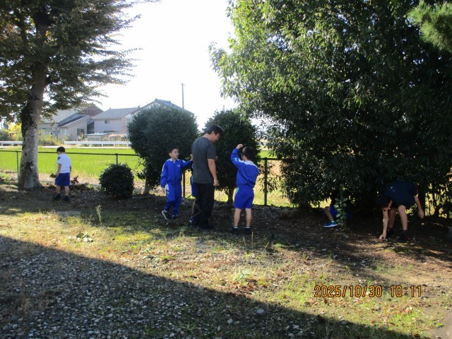 今日は、気持ちのよい天気です。1・2年生は、ドングリの木の下で、ドングリの実を探していました。まだ緑色の実がたくさん木になっています。