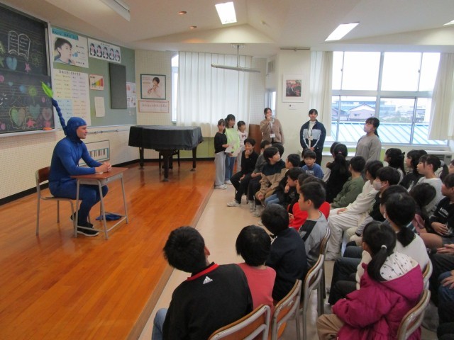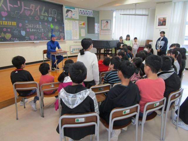 イマージョンALTの先生から、英語の絵本の読み聞かせをしていただきました。ALTの先生は、絵本の世界から飛び出してきたような服装で、子供たちを楽しませてくださいました。読み聞かせが終わった後は、子供たちが感想を伝え合いました。