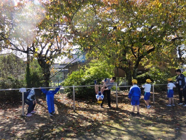 1~3年生の子供たちは、グラウンドで鉄棒の学習をしました。「どうしたらうまくできるか教えて」「こうしたらうまくできるよ」などと教え合い、できるようになるまで練習に取り組んでいました。