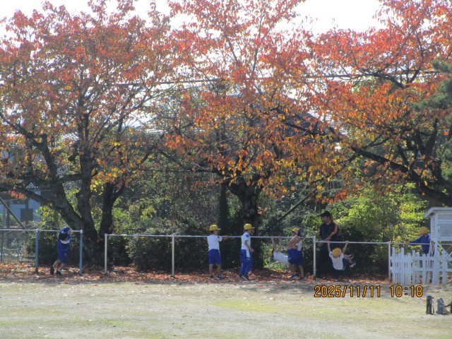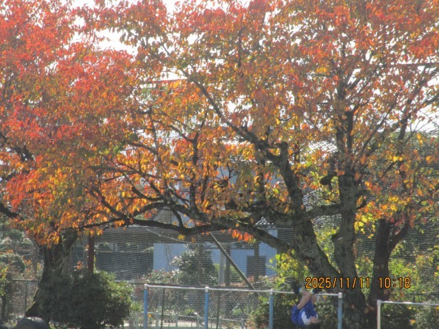 グラウンドのサクラの木がきれいに紅葉しています。木の下では、1・2年生が鉄棒で遊んでいます。