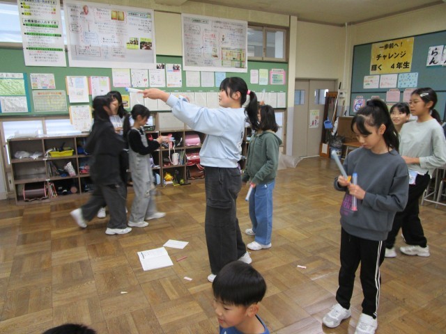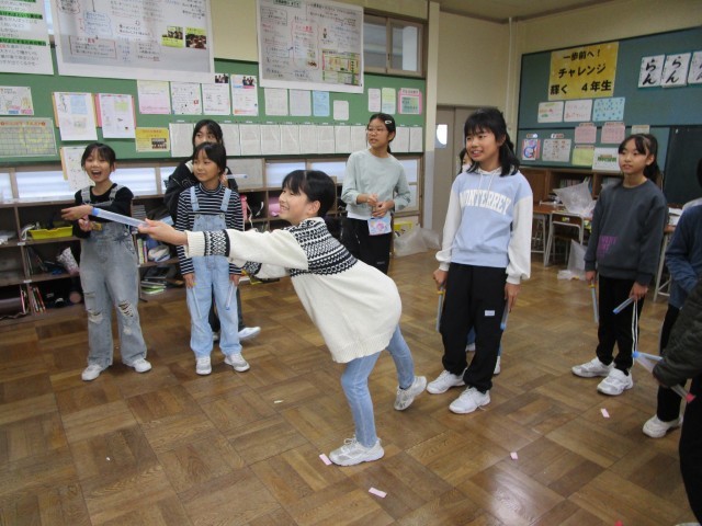 理科では、「とじこめた空気は、押すと体積が小さくなる」ことを学習しました。学級では、学んだことを生かして、「空気でっぽう的当て」をしました。「ゆっくり押すとあまり飛ばないよ」など学んだことを生かして教え合う子供の姿が見られました。