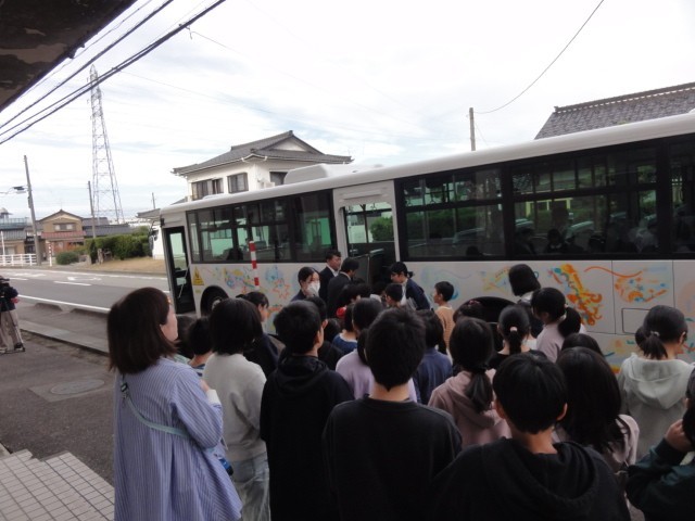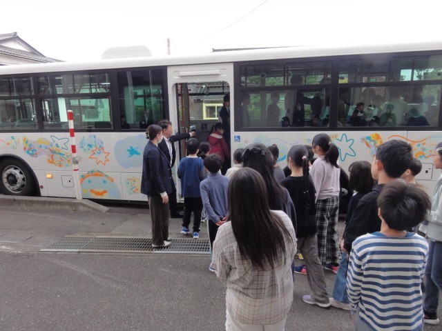 利用の仕方や約束を座学で学習した後は、スクールバスに乗ってみました。小さい学年から順番に乗車することや、座れないときには手すりや吊り輪に捕まるなど、利用する約束を確認していました。