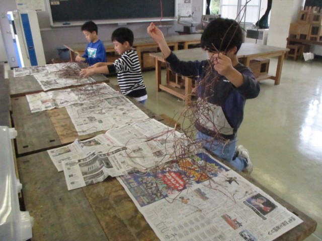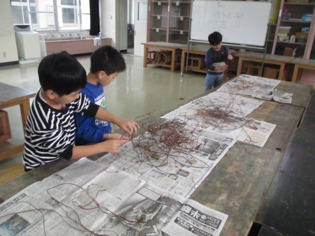 アサガオのつるを分けました。長いつるでリースが作れるようにていねいにほどいていました。早く終わったら、協力していました。