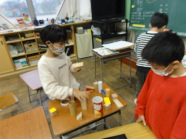 1年生は、筒や箱の形を紙を写す学習をしました。鉛筆で周囲をなぞると、側面の形が分かります。丸や四角形等、いろいろな形があることが分かったようです。