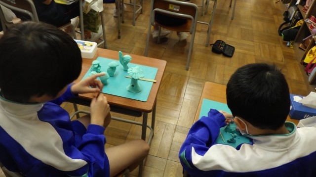 粘土で、きのこや恐竜、お菓子等自分の世界を表現しています。線や表情といった細かい部分まで丁寧に作っていました。