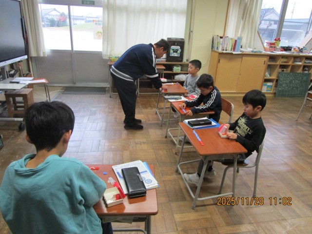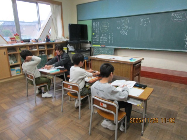 1・2年生は、算数科の学習中です。1年生は、算数ブロックを操作して、引き算の仕方を考えています。2年生は、おはじきを使って、掛け算のしくみについて考えています。