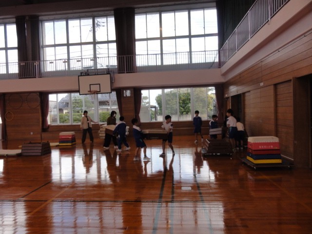 1~3年生は、体育科で跳び箱運動に取り組んでいます。各自ができるようになりたい技に挑戦しています。運動が終わった後は、用具を自分たちで協力しながらきちんと片付けていました。