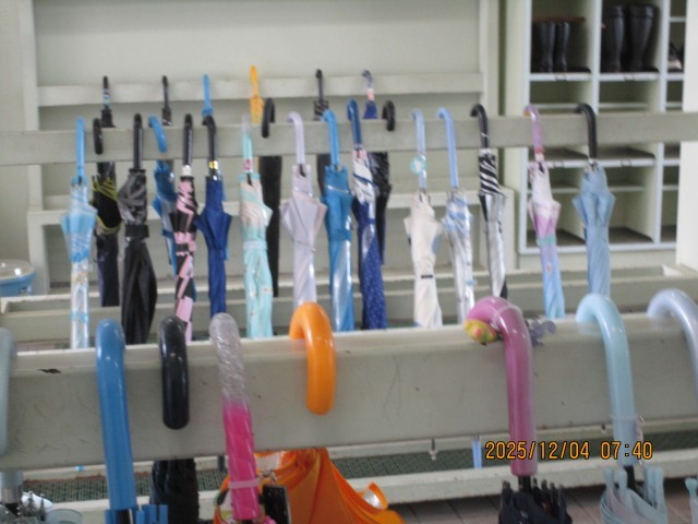 雪の降る寒い朝になりました。子供たちが登校した後の児童玄関の様子です。今日も、傘布をきれいに巻いて、きちんとかけられています。
