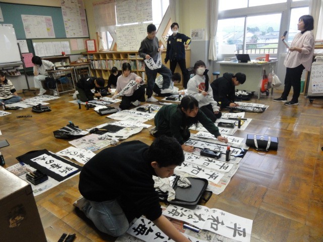 書写の時間に、書き初めの練習をしています。5・6年生の子供たちは、文字の大きさや余白のバランスに気を付けながら、丁寧に書いていました。