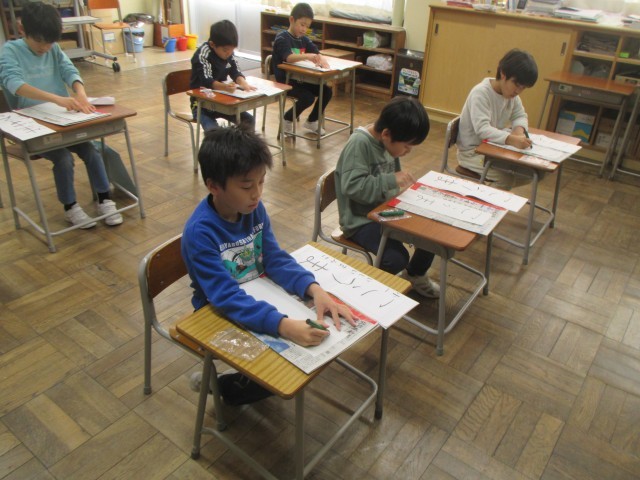 1月8日の校内書初大会に向けて、手本をよく見てじっくりと字を書きました。