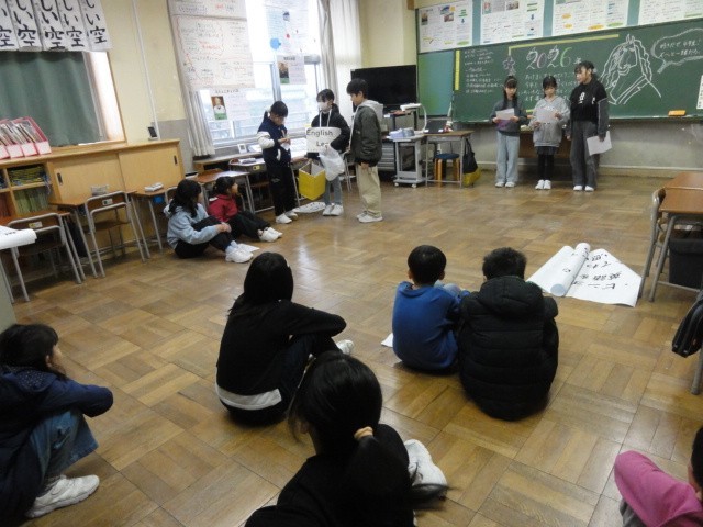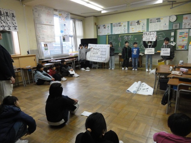 始業式と書初大会を終えた後、4年生は、3学期に実施するイマージョン集会の練習に取り組みました。4年生は、全校のみんなに英語に親しんでもらおうと、活動に意欲的に取り組んでいます。集会に向けて、全校に楽しんでもらうために、正しい発音で英語を話すなど、分かりやすく伝わるように練習をしていました。