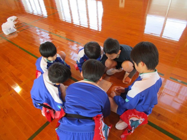 2つのチームに分かれてフラッグを取り合う「宝とりゲーム」をしました。各チーム、前回の反省を生かして作戦を立て、より多くのボールをゴールに運ぶためにはどうしたらいいか考えてゲームに取り組んでいました。