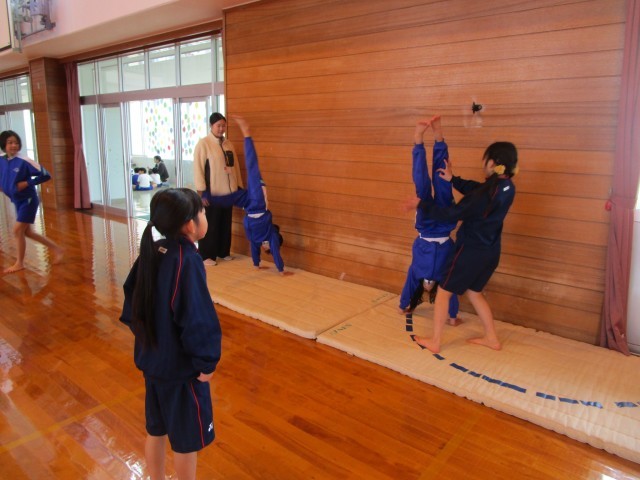 グループごとに、うさぎ跳びや蛙の足打ちなどのウォーミングアップをしてから、一人一人が目当てをもって、いろいろな技にチャレンジしていました。