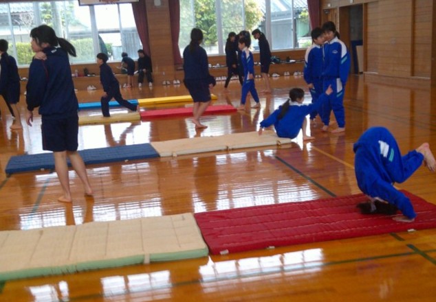 4~6年生の体育科で、マット運動の学習をしています。技のポイントは、ホワイトボードの掲示物に表示してあり、子供たちはどの技に取り組むか参考にして、今日練習する技を決めました。各自ができるようになりたい技に分かれて、練習をしました。うまくできるようになるまで、繰り返し練習し、子供たちは熱心に取り組んでいました。