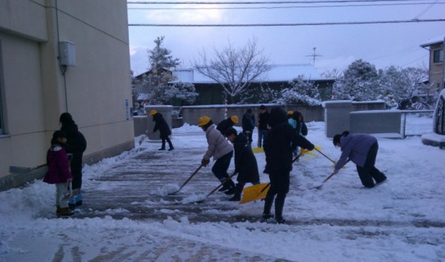 上学年の子供たちが、除雪作業をしました。5・6年生が作業をしているところを見て、4年生も一緒に除雪に協力していました。子供たちのおかげで、玄関前がきれいに除雪され、歩きやすくなりました。
