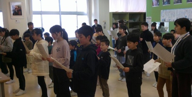 閉校式に向けて、音楽室に集まり、全校で歌の練習をしました。音の高さや、盛り上げていくところについて、気を付けるところをポイントをおさえながら、丁寧に歌っています。高い音程の部分も、きれいな声で歌うように子供たちは意識しながら、練習に取り組んでいます。