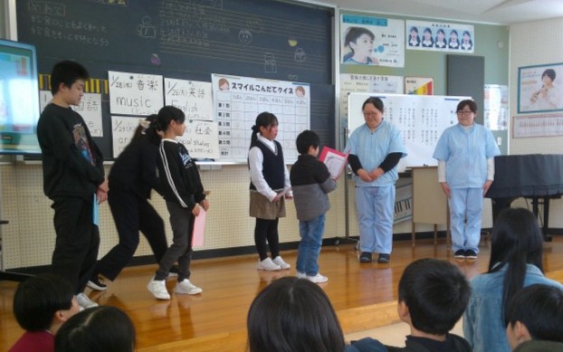学校給食週間に伴い、調理員さんを招いて給食集会を行いました。集会では、学校給食週間の献立に関連したクイズが出題されました。クイズの答えを考える間、スマイル委員会の子供たちが音楽に合わせてダンスをして、とても楽しい雰囲気でした。調理員さんからは、料理や食材に関して知りたいことがあれば興味をもってほしい、しっかり食べて元気な体をつくってほしいと話されました。子供たちはいつもおいしい給食を作ってくださって調理員さんに感謝の気持ちを伝え、今後も残さず食べようという思いに高めていました。