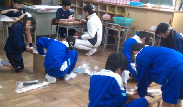 3・4年生は、金づちやのこぎりを使って、木片を組み合わせ作品を作ります。子供たちは、木片が動かないように友達にしっかりと押さえてもらいながら、のこぎりを使って切っていました。