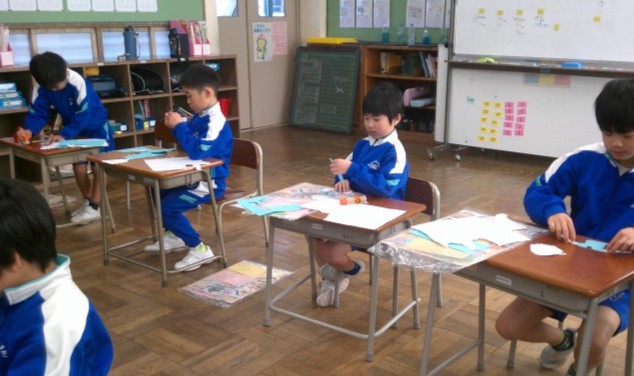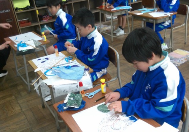 1・2年生は、図画工作科で版画の製作をしています。いろいろな紙や材料を自分が作りたい形に切り、台紙に張り付けていきます。紙や材料の模様の組み合わせを考えながら、子供たちは集中して取り組んでいました。