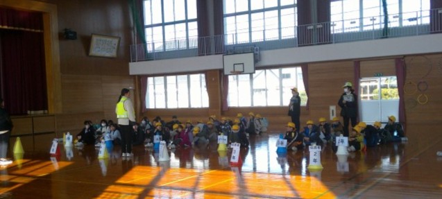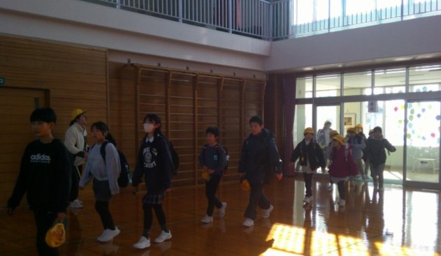 近隣で不審者情報が入ったという想定で、体育館へ避難する訓練を行いました。子供たちは、静かに素早く避難場所へ移動し、しっかりと先生の話を聴いていました。