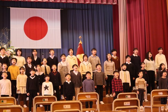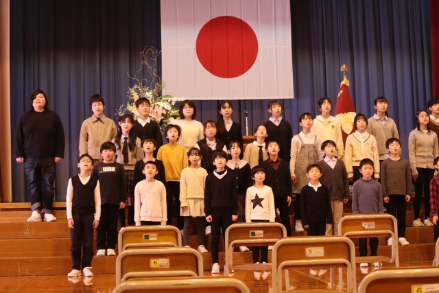 閉校式では、児童のことばを全校児童で述べました。まっすぐ前を向き、大きな声で言葉を言う子供たちの表情は、真剣でした。ひろい世界への歌は、全員で声を合わせ、きれいな歌声が体育館に響きました。子供たちが閉校に向けて、言葉や歌に自分の思いを込めていることが伝わり、感動的でした。