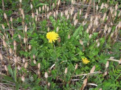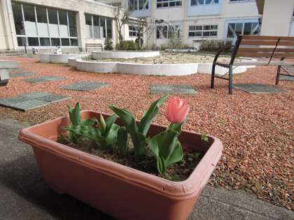 MTガーデンの、プランターのチューリップは、花が咲きました。花壇はもうすぐです。駐車場横には、ツクシやタンポポ、オオイヌノフグリが咲き誇ってます。春ですね。