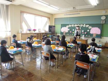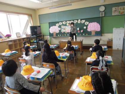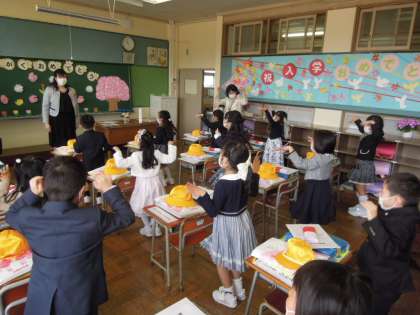 入学式を終え、自分たちの教室に入った1年生。先生の話を姿勢を正して聞いています。先生に自己紹介をしてもらった後、体を使った楽しいゲームをしました。