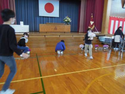 5、6年生は、入学式後、式場の片付けをがんばりました。その後は、きれいな桜の木の下でクラスの集合写真。ご苦労様でした。
