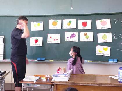 「I like banana.」などと英語で発表することができました。友達の発表には大きな拍手を送りました。楽しく外国語を学ぶことができました。